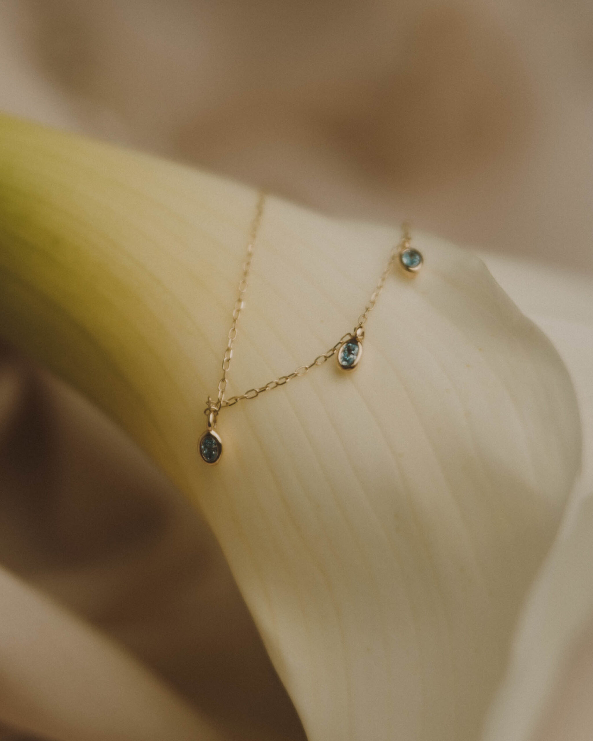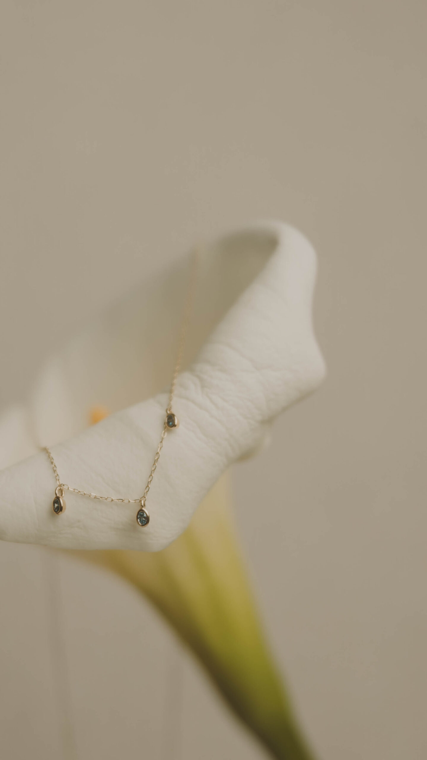 Cadena de 18 pulgadas con tres dijes de diamante azul en corte oval montado en bisel en oro amarillo 14k