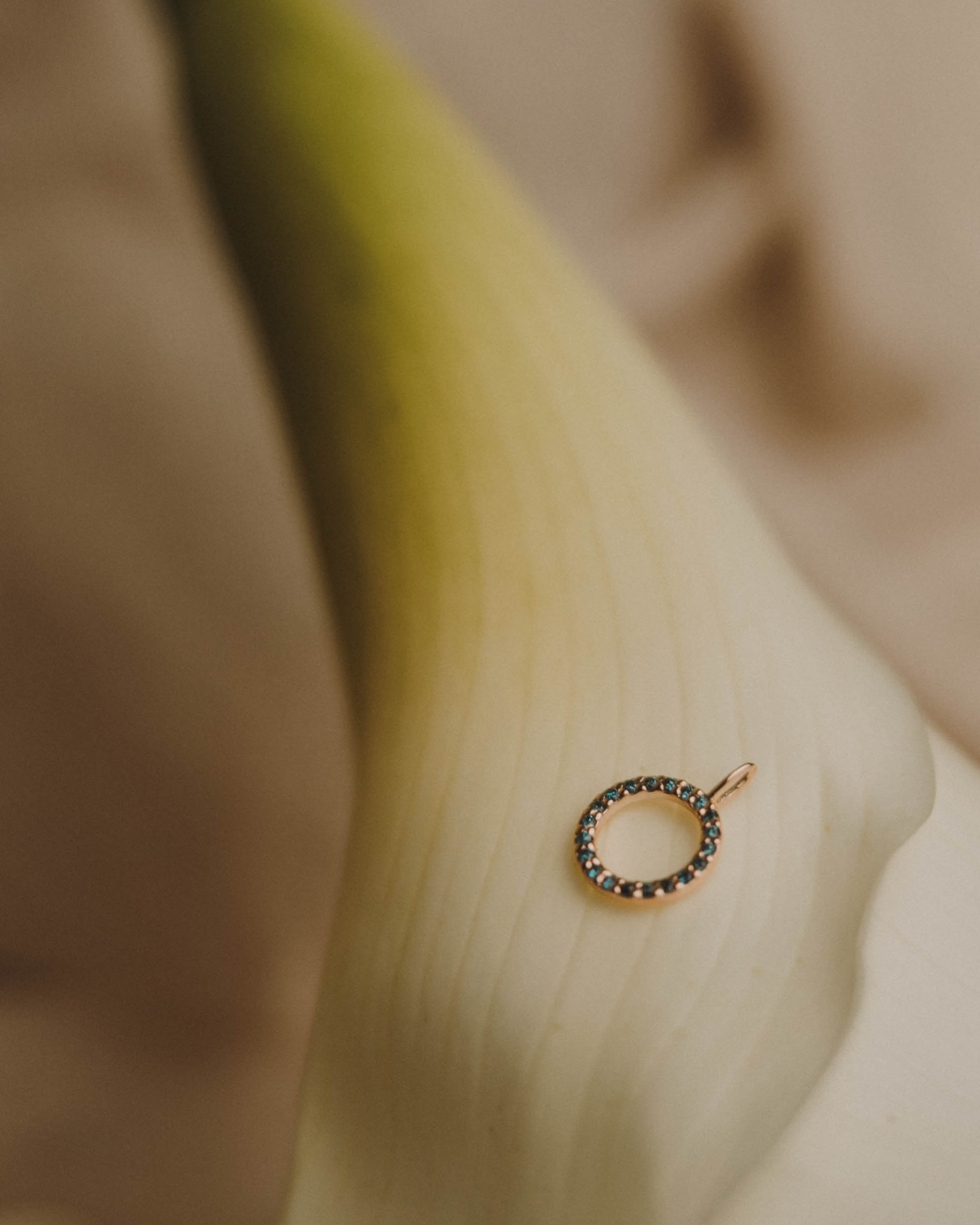 Cadena de 18 pulgadas con dije en círculo con 20 diamantes azules de 1mm en oro rosa 14k